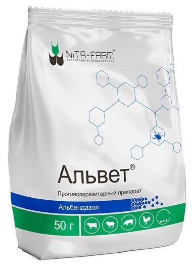 Альвет обладает широким спектром антигельминтного действия, активен в отношении половозрелых и неполовозрелых нематод и цестод, а также половозрелых трематод. Обладая овоцидным действием, снижает зараженность гельминтами пастбищ. Механизм действия альбендазола, входящего в состав препарата, заключается в нарушении процессов транспорта глюкозы, микротурбулярной функции и снижении активности фумаратредуктазы у гельминтов, что приводит к их гибели. При пероральном введении препарата альбендазол быстро всасывается в желудочно-кишечном тракте и проникает в органы и ткани; из организма выделяется в основном с мочой и фекалиями. Альвет по степени воздействия на организм относится к умеренно опасным веществам, не обладает гепатотоксическим и сенсибилизирующим действием.