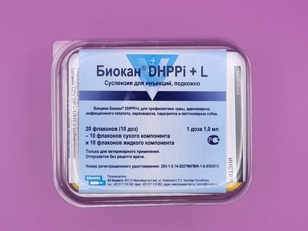 Биокан DHPPi+L - вакцина против собачьей чумы (CDV), инфекционного гепатита (CAV-1), инфекционного ларинготрахеита (CAV-2), парвовироза (CPV-2) парагриппа (CPIV-2) – живая, и против лептоспироза (бактерии групп L. Icterohaemorrhagiae инактивированные, L. Canicola инактивированные, L. grippotyphosa инактивированные) у собак, инактивированная