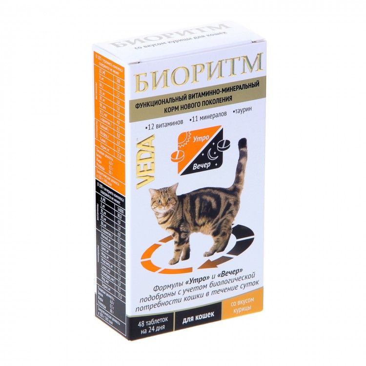 Витаминно-минеральный комплекс «Биоритм» утро и вечер благодаря наличию сбалансированного количества витаминов, минералов и других активных соединений, специально подобранных в зависимости от потребности организма, восполняет дефицит этих биологически активных веществ в организме кошек, поддерживает активность животного на весь день, способствует нормализации обмена веществ и энергии. В процессе приготовления готовой формы использовались микрокапсулированные субстанции, что позволило защитить биологически активные соединения от возможного химического разрушения и потери активности, кроме того состав комплекса подобран в строгом соответствии с особенностями метаболизма взрослых животных, характером химического взаимодействия составляющих его элементов и порядком их резорбции после перорального приема. Применение витаминно-минерального комплекса стимулирует процессы кроветворения, окислительно-восстановительные реакции, повышает неспецифическую резистентность организма, положительно влияет на состояние кожно-волосяного покрова и опорно-двигательного аппарата. Таурин, входящий в состав комплекса ускоряет процессы регенерации, стимулирует и нормализует энергетический и пластический обмен, оказывает антитоксическое действие, усиливает биохимические и физиологические восстановительные процессы в тканях глаза. По степени воздействия на организм теплокровных животных витаминно-минеральный комплекс «Биоритм» относится к малоопасным веществам, в рекомендуемых дозах не оказывает эмбриотоксического, тератогенного и сенсибилизирующего действия.