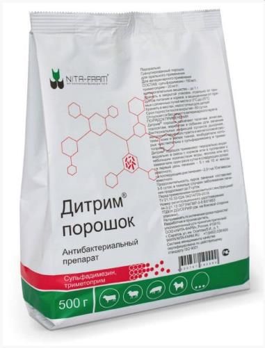 Фармакологические свойства: Сульфадимезин и триметоприм, входящие в состав препарата, проявляют синергизм действия, т. е. усиливают действие друг друга путем последовательного воздействия на метаболизм n-аминобензойной и фолиевой кислот в микробной клетке. Взаимодействие этих компонентов способствует расширению антибактериального спектра действия препарата. Спектр действия препарата охватывает грамположительные и грамотрицательные микроорганизмы, в т. ч. E. coli, Clostridium spp., Salmonella spp., Proteus spp., Bacillus anthracis, Pasteurella spp., Haemophilus spp., Vibrio spp., Staphylococcus spp., Streptococcus spp., Shigella spp., Corynebacterium spp., Klebsiella spp., Fusobacterium spp., Bordetella spp., Brucella spp.). После перорального применения дитрим порошок быстро всасывается в желудочно-кишечном тракте и проникает в органы и ткани организма животного, достигая максимальной концентрации через 2 – 3 часа после введения. Антибактериальное действие поддерживается в течение суток. Дитрим порошок по степени воздействия на организм теплокровных животных относится к умеренно опасным веществам, в рекомендуемых дозах не оказывает сенсибилизирующего, эмбриотоксического, тератогенного и мутагенного действия. Выводится из организма преимущественно с мочой и фекалиями.