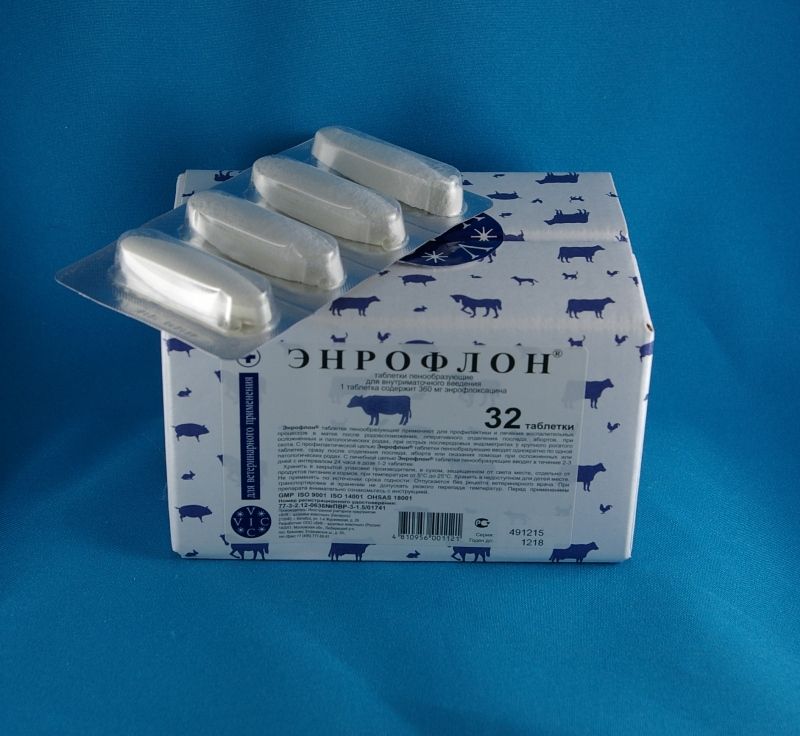 Антибактериальный препарат, содержащий в качестве действующего вещества энрофлоксацин (0,36 г в каждой таблетке).