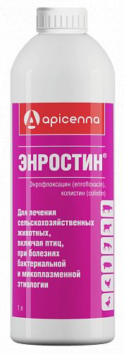 Энростин — комплексный противомикробный препарат для животных (Международное непатентованное наименование: энрофлоксацин + колистина сульфат) в 1 мл содержит 106 МЕ колистина сульфата и 100 мг энрофлоксацина, а также вспомогательные компоненты: бензиловый спирт, метабисульфит натрия, молочную кислоту и воду дистиллированную. По внешнему виду представляет собой раствор для применения внутрь, при хранении которого допускается слабое помутнение, исчезающее после взбалтывания. Расфасовывают во флаконы или бутыли из темного пластика по 100 мл.