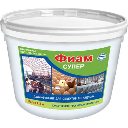 Фиам Супер - безопасное средство для санитарной и дезинфекционной обработки помещений, оборудования, предметов транспортировки на объектах ветнадзора и профилактики инфекционных болезней животных и птицы, включая птичий грипп: микробов, грамположительных и грамотрицательных бактерий (включая микобактерии туберкулеза), грибов (рода Кандида и Трихофитон), вирусов (включая возбудителей гепатита В и ВИЧ-инфекций).
