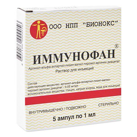 СОСТАВ И ФОРМА ВЫПУСКА: 0,005%-ный раствор для инъекций. Иммунофан - синтетический регуляторный гексапептид структурной формулы аргинил-а-аспартил-лизил-валил-тирозил-аргинин, являющийся иммуноактивным производным фрагментом молекулы тимопоэтина. Представляет собой однородную, прозрачную, бесцветную жидкость без запаха. Выпускают в ампулах по 1 мл.