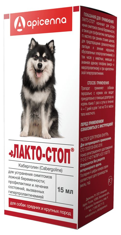 Лакто-Стоп – препарат для устранения симптомов ложной беременности и гиперпролактинемии у собак средних и крупных пород, 15 мл