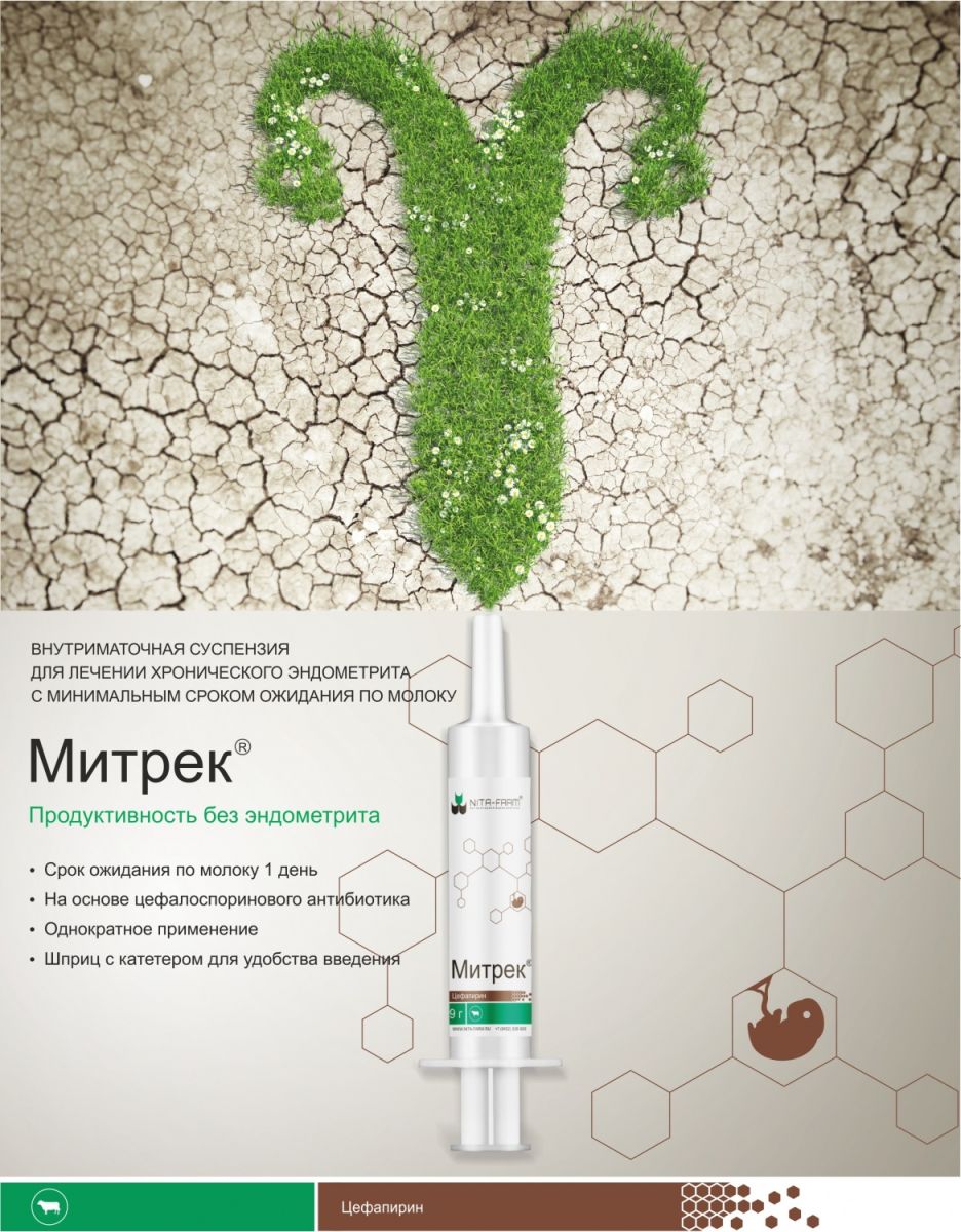 11. Митрек® применяют коровам для лечения подострой и хронической форм эндометрита бактериальной этиологии, возникающих, как правило, спустя 14 суток после отела, а также при скрытых формах эндометрита.