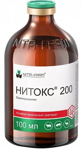 8. Препарат применяют животным однократно глубоко внутримышечно в дозе 1 мл Нитокса 200 на 10 кг массы животного (20 мг окситетрациклина дигидрата на 1 кг массы). При необходимости инъекцию лекарственного средства повторяют через 72 часа.