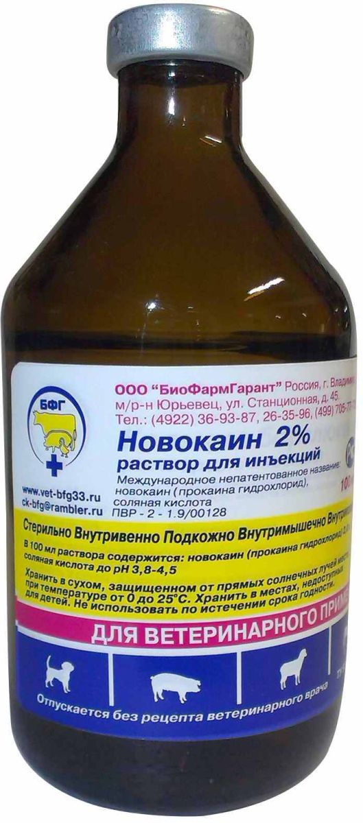 Новокаин блокирует натриевые каналы, вытесняет кальций из рецепторов, расположенных на внутренней поверхности мембраны и, таким образом, препятствует генерации импульсов в окончаниях чувствительных нервов и проведению импульсов по нервным волокнам. Подавляет проведение не только болевых, но и импульсов другой модальности. При внутривенном введении оказывает общее действие на организм животных, уменьшает образование ацетилхолина и понижает возбудимость периферических холинреактивных систем, оказывает блокирующее влияние на вегетативные ганглии, уменьшает спазмы гладкой мускулатуры, понижает возбудимость мышцы сердца и возбудимость моторных зон коры головного мозга. В токсических дозах вызывает возбуждение, затем паралич центральной нервной системы. В организме быстро гидролизуется, образуя парааминобензойную кислоту и диэтиламиноэтанол, которые являются фармакологически активными веществами. После введения лекарственный препарат действует быстро и кратковременно.