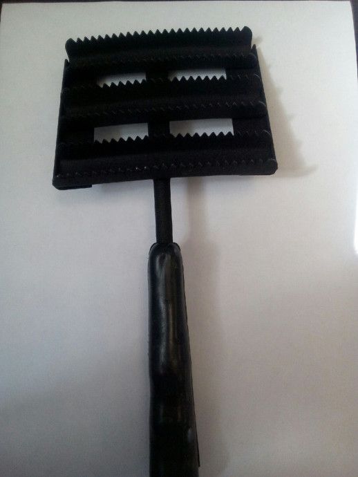 Скребница изготовлена в двухстороннем исполнении. Для поверхностной чистки используются три ряда мелких зубцов, для более глубокой чистки и при сильном загрязнении используется верхний ряд крупных зубцов. На нижней части имеется 3 ряда мелких зубцов. Верхний и нижний ряд состоят из 20 зубцов высотой 6 мм, средний ряд состоит из 18 зубцов высотой 6 мм. На верхней части имеется один ряд из 6 зубцов высотой 16 мм. Благодаря жесткой обрезиненной рукоятке, скребница удобно располагается в ладони.