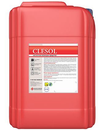 Clesol – это кислотное моющее средство, востребованное для обработки оборудования и тары на молочных комбинатах и предприятиях по изготовлению питьевых продуктов, молочных фермах. Представляет собой бесцветную прозрачную жидкость с легким кислотным запахом.