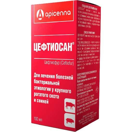 Цефтиосан — антибиотик из группы цефалоспоринов для лечения бактериальных инфекций у крупного рогатого скота и свиней, который в качестве действующего вещества в 1 мл содержит 50 мг цефтиофура гидрохлорида, а в качестве вспомогательные компоненты: алюминия моностеарат, сорбитан монолеат и триглицериды средней длины цепи (MCТs). По внешнему виду препарат представляет собой стерильную суспензию от белого до светло-желтого цвета для инъекций, при хранении которой возможно образование осадка, исчезающего при взбалтывании. Цефтиосан выпускают расфасованным по 10, 20, 50, 100 и 250 мл в стеклянные флаконы, упакованные в картонные коробки.