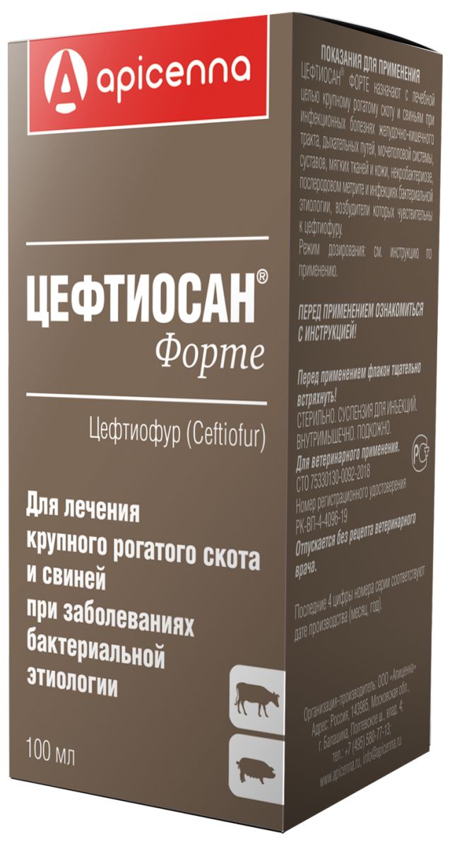 что приводит к гибели бактерий. После введения Цефтиосан Форте быстро резорбируется с места инъекции, цефтиофур метаболизируется с образованием десфуроилцефтиофура, который оказывает антибактериальное действие. Максимальная концентрация